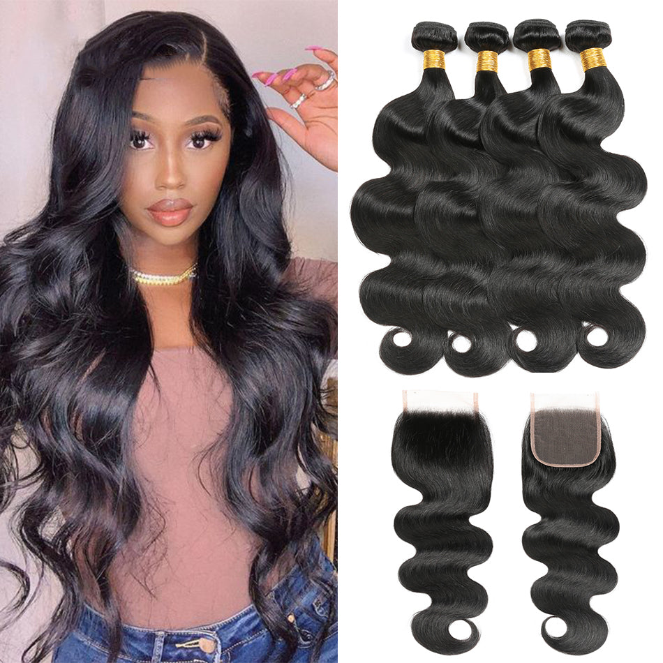 Body Wave Remy Human Hair 4 Bundles With 4*4 Lace Closure